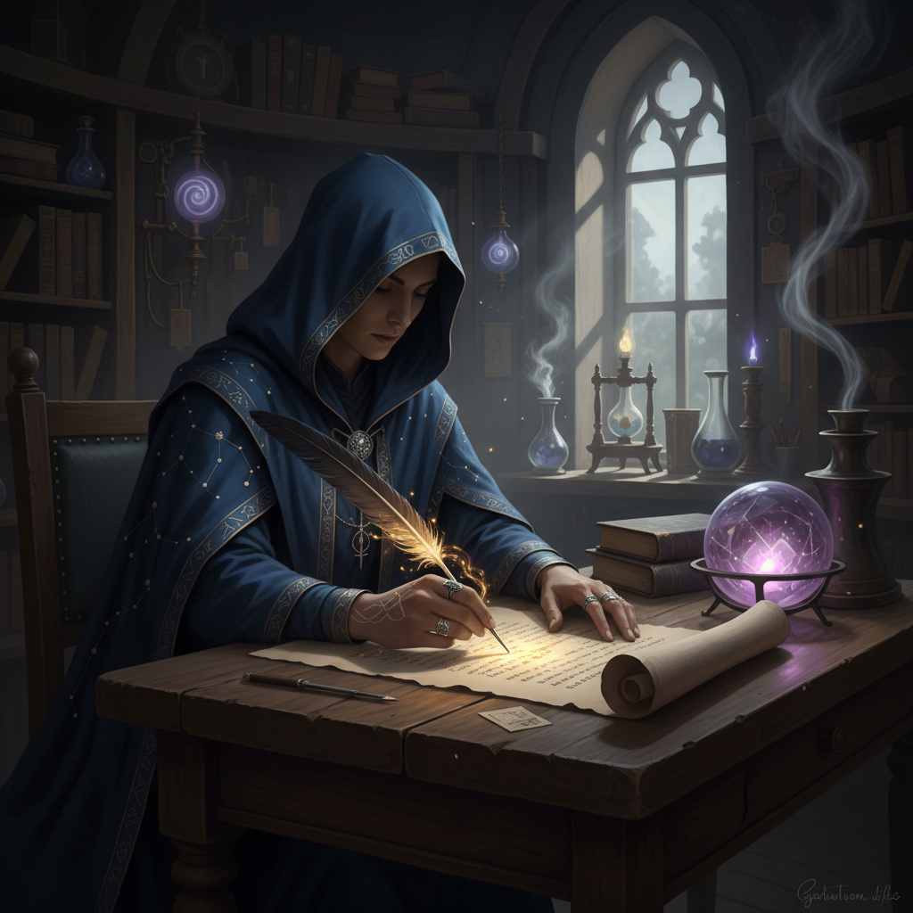 A person wearing an ornate blue hooded robe sits at a wooden desk, focused on writing with a glowing feather quill on aged parchment. The surrounding chamber is a dark, mystical study filled with bookshelves, glowing glass orbs, and a purple crystal ball that emits a soft light. Smoke curls from glass vials near an arched window, while the overall atmosphere is one of quiet, magical concentration.
