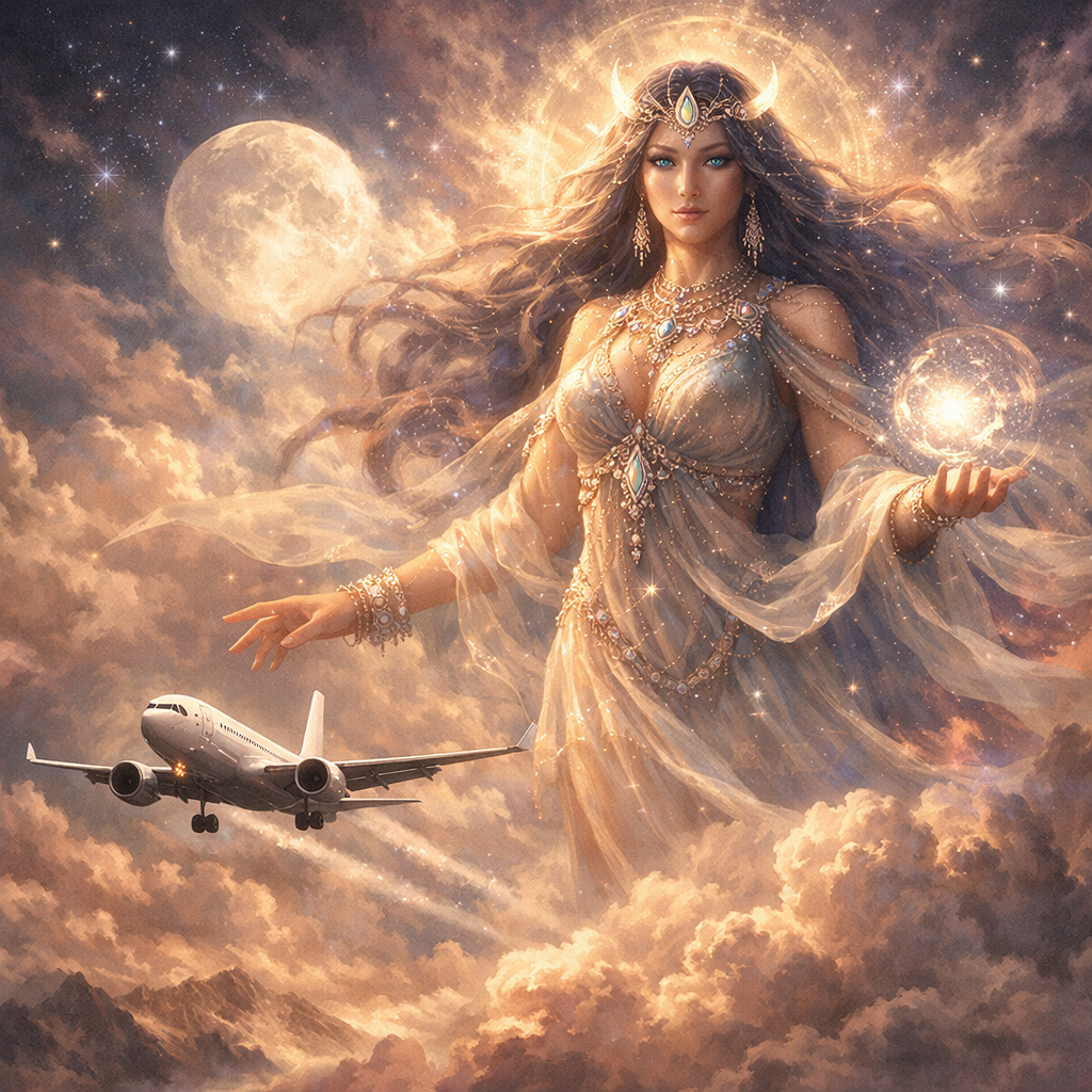 The image depicts a majestic celestial goddess surrounded by glowing stars and clouds, holding a radiant orb of light in one hand. She wears an elaborate, translucent gown adorned with jewels and a crown, with her long hair flowing in the cosmic breeze. Below her, an airplane flies through dense clouds illuminated by the moon, creating a magical and surreal atmosphere that blends fantasy with elements of modern aviation. The soft golden and lavender hues evoke a sense of wonder and divine guidance.