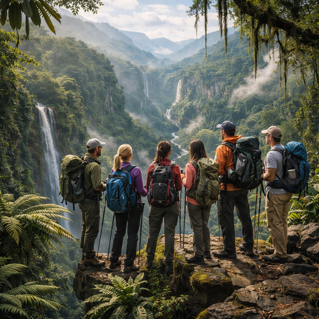 The image shows a hiker dressed in an orange jacket and khaki pants, equipped with a large green backpack and hiking poles, standing on a rocky outcrop. The hiker overlooks a lush, green valley with dense forests covering the steep mountainsides. A tall waterfall cascades down a cliff on the left side, with mist rising around it. The valley narrows into a winding river running through the center, surrounded by layers of mist and cloud shrouding parts of the landscape. The scene is vibrant and serene, conveying the beauty and grandeur of a remote mountainous wilderness.