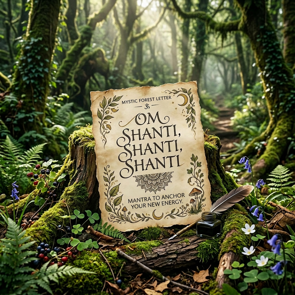 The image features an aged, decorative letter resting on a moss-covered tree stump in a dense, green forest. The letter is titled ‘Mystic Forest Letter’ and prominently displays the mantra ‘Om Shanti, Shanti, Shanti’ surrounded by botanical illustrations of leaves, mushrooms, and crescent moons. The forest background is filled with twisted trees covered in moss, soft sunlight filtering through the canopy, and a winding dirt path leading deeper into the woods. The scene exudes a serene, mystical atmosphere, enhanced by scattered wildflowers, berries, a feather quill, and an ink bottle nearby, suggesting a connection with nature and peaceful reflection.
